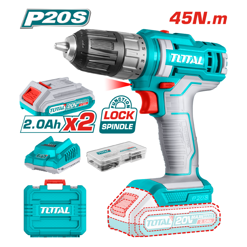Điện áp: 20V. Tốc độ không tải: 0-400/0-1500rpm. Mô-men xoắn cực đại: 45Nm. Khả năng khoan: 0,8-10mm. Thiết lập mô-men xoắn: 15+1. Bánh răng cơ khí 2 tốc độ. Chức năng khóa trục chính